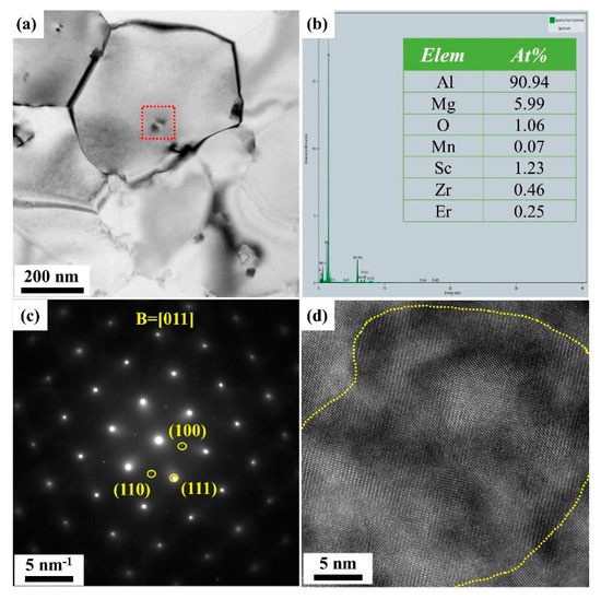 A bright field (BF)-STEM image taken from the FG region is presented in Figure 8a, and a bean-like phase within a grain is indicated by a red dotted box. Based on the energy dispersive X-ray spectroscopy (EDX) analysis (Figure 8b) and the selected area electron diffraction (SAED) pattern along the [011] zone axis (Figure 8c), the phase is identified as L12-structured Al3(Sc, Er, Zr). The high resolution (HR)-TEM image of this particle (Figure 8d) reveals a cube-on-cube orientation relationship with the Al matrix, so it is difficult to recognize the primary phase from XRD. Al3(Sc, Er, Zr), a non-stoichiometric compound with a core/double-shell structure, can be an ideal seed for fcc-Al growth as the similar lattice constant with α-Al (4.049 Å) [12,29,30]. Due to the high temperature in the central area at the top of the molten pool, primary Al3(Sc, Er, Zr) particles mainly exist in FG regions during the heat cycle of the SLM process [14].