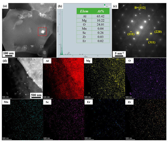 Al-Mg-oxide particles are a common primary phase in the sample, which has been reported by Ma et al. [31] and Spierings et al. [14]. The oxide inclusions created during the laser melting process and the oxide film of powders can provide sufficient oxygen. Figure 9a depicts the DF-TEM image of the FG region. The EDX results (Figure 9b) and the SAED pattern (Figure 9c) signify that the white rhombic particle less than 50 nm long is the Al2MgO4 phase with spinel structure [32]. This particle can promote the nucleation of the Al3(Sc, Er, Zr) precipitation and then the mixed phases can act as a seed for fcc-Al growth to form fine-grain regions. With a high melting point of 2408 K, some intragranular and intergranular Al2MgO4 particles can survive at CG regions, as Figure 9d shows. Furthermore, STEM-EDX elemental mapping indicated that there is no other primary phase in the CG region because the rapid solidification of SLM increases the solid solubility of elements in the matrix.