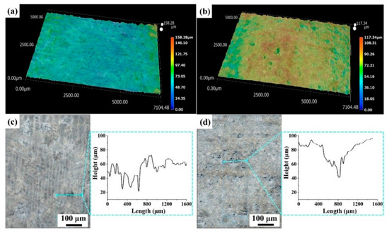 Three-dimensional surface morphologies of the as-built alloy after IGC tests: (a) surface roughness of XY plane; (b) surface roughness of XZ plane; (c) corrosion morphology and the depth of a corrosion pit for (a); (d) corrosion morphology and the depth of a corrosion pit for (b).