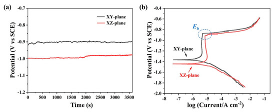 The corrosion current is directly proportional to the electrochemical corrosion rate, so a low corrosion current density coupled with a large polarization resistance indicates an increase in the corrosion resistance of the material [36]. From the results, the XY plane has better corrosion resistance since it has a lower Icorr (2.512 μA·cm−2), a higher Ecorr (−1354.83 mV) and a higher Rp (2.999 × 104 Ω·cm2) compared to the XZ plane (Icorr = 4.681 μA·cm−2; Ecorr = −1.455.47 mV; Rp = 1.972 × 104 Ω·cm2). Furthermore, the XY plane has a higher breakdown potential (Eb), which means that the stability of the passive film on the surface is better than the XZ plane.