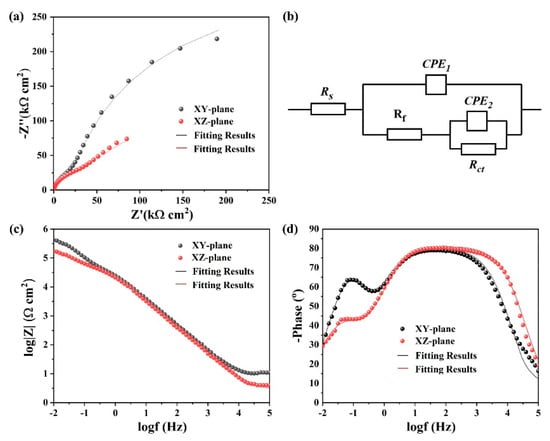 where Q and α are CPE parameters and Rf is the film resistance on the surface, so d is inversely proportional to [Q × Rf(1 − α)]−α. According to the fitting results of the parameters in Table 2 and Equations (1) and (2), it can be determined that the d of the XY plane is thicker. Moreover, the Rf of the XY plane (67.22 kΩ·cm2) is higher than that of the XZ plane (51.78 kΩ·cm2). Therefore, the XY plane of the SLMed sample possesses a superior corrosion resistance, which is consistent with the conclusion of the potentiodynamic polarization tests.