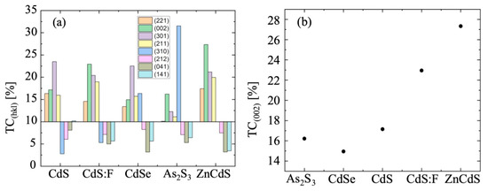 Since this material crystallizes in the orthorhombic phase, with ribbons stacked in parallel in the direction [6], this is believed to be the direction in which charge transport is favoured [47,49]. Sample D (), in which was grown by exploiting the quasi-rheotaxia phenomenon, conversely shows a very high , almost negligible in other samples, except for sample C. As depicted in Figure 5b, the growth along the [001] direction is strongly window layer dependent, and it seems favoured by window layers containing zinc, reaching the maximum value of 27% for the texture coefficient of sample E.