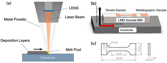 (a) Schematic diagrams of the LMD process; (b) sample location and build direction; (c) geometric size of the tensile specimen in mm.