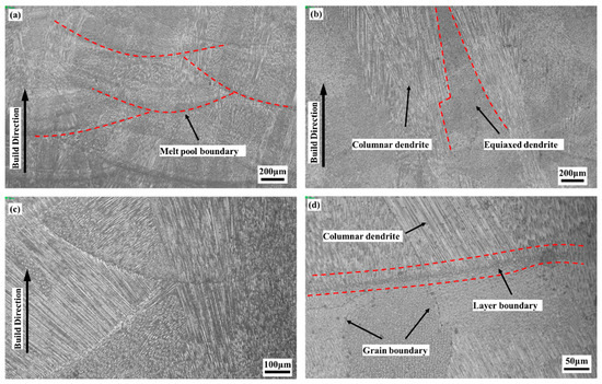 Figure 3 shows the melt pool morphology in the YZ cross-section of the deposited sample. Due to the Gaussian distribution of the laser energy, the typical fish scale shape of the melt pool can be observed in Figure 3a. Each melt pool had a dimensional width of about 1.6–2.0 mm and a depth of about 0.4–0.5 mm. Figure 3c shows the melt pool at high magnification. A typical columnar dendritic microstructure was observed in the melt pool. The dendritic structures grew perpendicular to the direction of the melt pool boundary, which was also the direction of the highest temperature gradient. As shown in Figure 3b, the microstructure of Inconel 690 in the deposited state consists mainly of columnar crystals and intercrystalline dendritic substructures that grew epitaxially along the deposition direction through multiple deposited layers. It had a columnar microstructure achieved by epitaxial growth due to the high solidification rate (103 K/s) and high-temperature gradient (104 K/mm) during the deposition process [32]. During solidification, the average growth of the melt pool was approximately antiparallel to the heat flow direction and perpendicular to the solid-liquid interface. This microstructure was also found in other grades of laser-deposited nickel-based alloys [33]. From Figure 3d, it can be noticed that there was a transparent layer boundary in the deposited state samples. This phenomenon is common in additively manufactured nickel-based high-temperature alloys and titanium alloys, and the mechanism of layer boundary formation has been discussed in the literature [34,35]. In addition, the microstructure pictures show that there are almost no defects, such as pores and cracks.