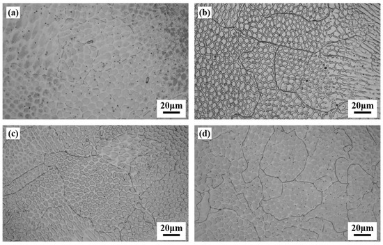 Microstructure of samples with different Mo contents in the deposited state: (a) Inconel 690; (b) 1.5 wt.% Mo; (c) 2.5 wt.% Mo; (d) 3.5 wt.% Mo.