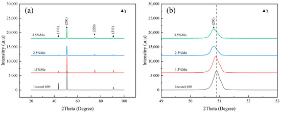 The X-ray diffraction curves of the samples with different Mo contents are shown in Figure 6. XRD results show that the deposited state microstructures of all four compositional alloys consist of γ, and the characteristic peaks of (111), (200), (220), and (311) can be observed. No diffraction peaks of the precipitated phases were detected for the deposited state Inconel 690, most likely due to the precipitate content being below the detection limit of the device. As shown in Figure 6b, by zooming in on the (100) crystal plane diffraction peaks, it can be seen that the diffraction peaks of the γ matrix are left shifted in the corresponding angle with increasing Mo content. From Bragg’s law (2dsinθ = nλ), it can be obtained that the crystal plane spacing of the γ matrix increases, and the corresponding diffraction angle decreases slightly. The strengthening mechanism of Inconel 690 is mainly solid solution strengthening. With increasing Mo content, more Mo elements solid solution to the cell parameters become larger, and the crystalline surface, spacing becomes larger. The solution element atoms lead to lattice distortion when Ni atoms are replaced.