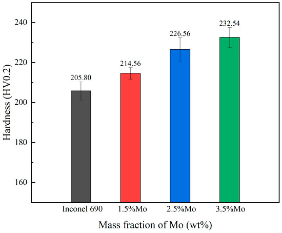 The average hardness values of Inconel 690 in the deposited state for the four Mo contents are shown in Figure 7. The hardness values of the samples increase with the increase of Mo elements. The hardness of the samples increased to 232.54 HV with the addition of 3.5 wt.% Mo. This is mainly attributed to the solid solution strengthening effect, where the lattice distortion caused by the solid solution of Mo elements increases the resistance to dislocation movement and makes the slip deformation of the metal more difficult, thus increasing the hardness of the alloy.