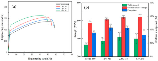 Figure 8a shows the engineering stress-strain curves of Inconel 690 in the deposited state with different Mo contents, and the corresponding room temperature tensile properties results are shown in Figure 8b. The strength of the deposited Inconel 690 continues to increase with increasing Mo content, while the elongation decreases continuously after reaching a maximum of 1.5 wt.% Mo. At 2.5 wt.% Mo content, the yield strength of deposited Inconel 690 reached a maximum value of 418.3 ± 44 MPa. At 3.5 wt.% Mo, the ultimate tensile strength of deposited Inconel 690 reached a maximum value of 640.2 ± 13 MPa. The tensile test results indicate that Mo addition increases the ultimate tensile strength and yield strength but decreases the elongation of the LMD deposited state. Solid solution strengthening is the main contributor to the strength increase due to the increase in Mo content. The continuous precipitation of M23C6 carbides at grain boundaries after exceeding 2.5 wt.% Mo leads to a decrease in plasticity. The yield strength, tensile strength, and elongation of Inconel 690 in the deposited state were 331.0 MPa, 574.4 MPa, and 35.3%, respectively, which met the requirements of Inconel 690 welded joints (tensile strength > 552 MPa, elongation > 30%). Comparing the mechanical properties of Inconel 690 fabricated by WAAM based on overlay welding [36], Inconel 690 fabricated by LMD showed higher yield strength, tensile strength, and elongation. The application of additive manufacturing technologies in the nuclear material Inconel 690 alloy has been proven feasible and effective, especially the LMD technology based on powder filled. According to the literature [37], heat treatment of nickel-based alloys in the deposited state can significantly improve their elongation, and we will study this issue in our following work.