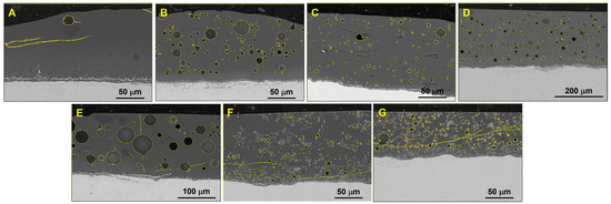 SEM cross-section images in the backscattered mode of the glass enamel coatings (coatings (A–G)) in the as-fabricated condition (pores and cracks are highlighted in yellow).