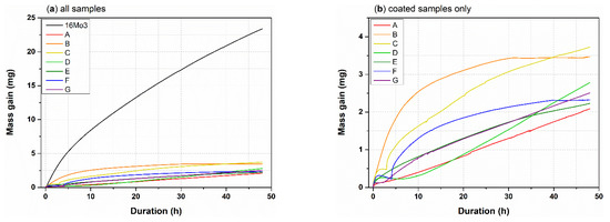 Specific mass gain curves obtained by TGA of (a) the raw material (reference 16Mo3) and coated samples exposed to Ar-10%H2O at 650 °C for 48 h; (b) presents the data of the coated samples only.