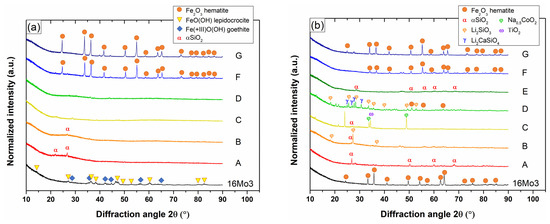 Figure 3 shows the XRD analyses performed on unexposed and exposed samples while Figure 4 and Table 4 show the results of the Raman analyses. The 16Mo3 substrate is covered with a lepidocrocite γ-FeOOH and goethite Fe(III)OOH oxide layer in the as-received conditions that further transforms into hematite α-Fe2O3 after exposure to 650 °C for 48 h in the Ar-10%H2O atmosphere. In contrast, the Raman spectra do not display any significant difference between the as-deposited and the oxidized enamel coatings, while the X-ray patterns of Figure 3b indicate the formation of some new phases attributed to the crystallization of silicate compounds.