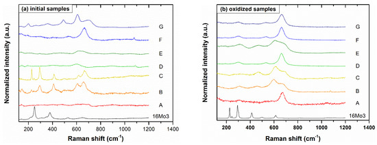 Raman spectra for (a) initial and (b) oxidized samples at 650 °C for 48 h in Ar-10%H2O atmosphere.
