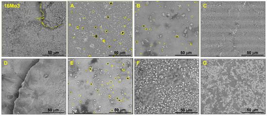 SEM images of the surfaces of uncoated 16Mo3 and coated samples ((A–G) coatings) exposed at 650 °C for 48 h in Ar-10%H2O atmosphere (pores and cracks are highlighted in yellow). Note that there were no oxide scales formed at the top of the enamel coatings.