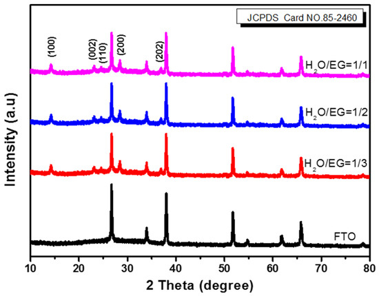 To determine the crystal structure and possible phase transitions under different hydrothermal conditions, XRD diffraction analysis was carried out. Figure 1 shows the XRD patterns of different WO3 nanostructures prepared by the hydrothermal method. It can be seen from the Figure that the main crystal planes of the WO3 films are (100), (002), (110), (200), and (202). With the addition of ethylene glycol (the total volume of water and ethylene glycol was 15 mL), the WO3 nanostructure did not change. The diffraction peaks of the WO3 films on the FTO conductive glass substrate correspond to the standard card JCPDS Card no. 70-4176. After removing the characteristic peaks of the FTO conductive glass substrate, all the characteristic peaks of the prepared WO3 films are consistent with the hexagonal phase h-WO3 (hexagonal, JCPDS No. 85-2460). Under hydrothermal conditions, urea is absorbed on the surface parallel to the c-axis, thus forming a strong energy barrier, and the control crystal grows mainly along the (100) and (200) planes. Therefore, the (100) and (200) peaks of the WO3 films are significantly enhanced, indicating that the WO3 films are highly oriented to the substrate surface. As the intercalation host of H+, Li+, Na+, K+, and other univalent ions, h-WO3 has been widely studied for preparing hexagonal tungsten bronze MxWO3 that modulates near-infrared light [31].
