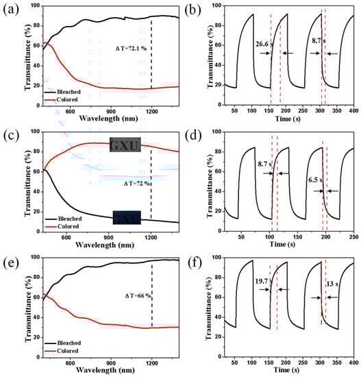 The primary energy used for buildings in the world is up to 30%–40%, which is mainly used for heating, cooling, lighting, ventilation, and household appliances [1,2]. A large part of this energy consumption is related to our inability to control the entry and exit of solar infrared light through windows. With the development of society and economy, dynamic regulation of solar light and heat flow can significantly reduce the energy consumption of buildings, and then reduce the characteristics of energy consumption, causing a global boom [3]. Electrochromic devices have attracted the attention of researchers because they can dynamically change indoor light and temperature, thereby effectively controlling solar thermal gain [4]. Electrochromism (EC) refers to the phenomenon that a material dynamically changes its optical properties (reflectivity, transmissivity, absorptivity) under applied voltage [5]. So far, the research on electrochromic properties not only focuses on the visible light, but also includes near-infrared that can change the indoor temperature. With the increasing demand for tunable near-infrared light (800–2000 nm) in solar thermal regulation, optical communication, aerospace, and military camouflage technologies, further research on infrared optical modulation is required [6,7]. In recent years, the Milliron group has studied various metal oxide nanomaterials, including doped semiconductor nanocrystals, non-stoichiometric oxides (WO3−x), etc., as electrochromic materials for near-infrared light [8]. All the aforementioned are based on the dynamically adjusted carrier concentration in nanocrystals and capacitive adsorption of local surface plasmon resonance (LSPR) through capacitive charge injection to achieve near-infrared selective light modulation [9,10]. For doped semiconductor nanocrystals, there are inevitable inherent defects. First of all, the LSPR peak of doped metal oxides (indium tin oxide and aluminum doped zinc oxide) is located in the near middle infrared region (1400 nm), and the wavelength below 1400 nm cannot be adjusted, while the near-infrared spectral range within 780–1400 nm accounts for more than 75% of the solar radiation, which makes the doped nanocrystals unable to modulate most of the short wave near-infrared radiation [11,12,13]. Secondly, the limitation of indium resources and the increase in material consumption make it more and more expensive.