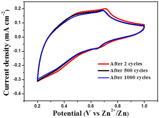 Cycling stability is an important parameter for practical electrochromic applications. To sum up, the WO3 nanosheets have better performance; to study the cyclic stability, the cyclic voltammetry was scanned at a rate of 20 mV/s. Figure 6 records the cyclic voltammetry curves after the second cycle, 500 cycles, and 1000 cycles. After 500 and 1000 electrochemical cycles, neither the shape of the cyclic voltammetry curves nor the corresponding peak currents were significantly different, 93.3% of the initial capacity is still retained after 500 cycles, and after 1000 cycles it still retained 90.2% of its initial capacity. It is worth noting that the peak anode current slightly shifts to the anode potential with the increase in the number of cycles. Upon a continuous number of cycles, the amount of zinc located in the reversible trap site increases and the role of the reversible trap site in the zinc insertion into the WO3 film is more significant, as a result, the anodic current peak slightly shifts in the anodic direction [34,35]. It shows that the WO3 nanosheets have high stability and durability under Zn2+ intercalation/extraction. This apparent stability may be due to the adsorption of EG on the h-WO3 films via hydrogen bonding or physical adsorption to make it more stable [36]. In summary, the characteristics of the WO3 films NIR electrochromism, including stability and optical modulation range, are shown in Table 2. The results show that the electrochemical stability of the WO3 nanosheets is better than that reported in the current study.