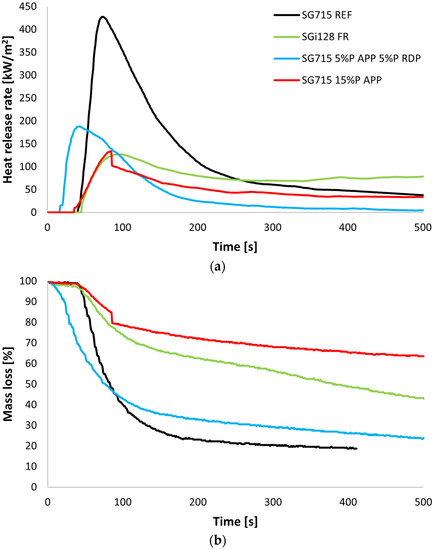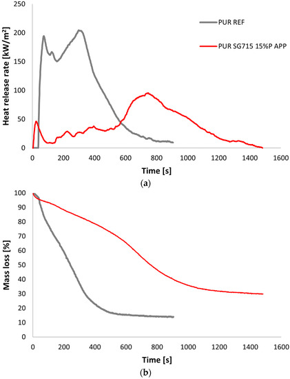 The flammability of the reference PUR sample and PUR sample coated with the SG715 15%P APP flame-retardant coating was investigated using a mass loss type cone calorimeter (Figure 5).