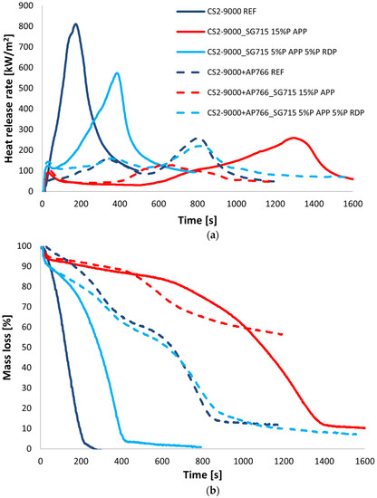 The heat release rate (a) and the mass loss (b) of CS2-9000-based reference and flame-retarded samples with and without coating.
