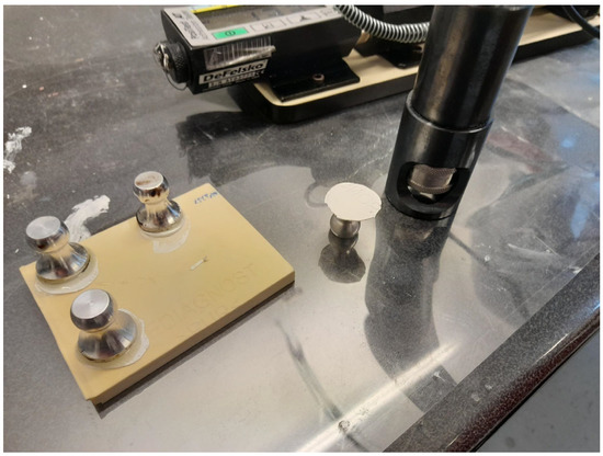 A pull-off adhesion test measured the adhesion between the PUR sample and the flame-retardant coating. The test was carried out according to ISO 4624/2016 standard using a DeFelsko PosiTest AT-M (Ogdensburg, NY, USA). The diameter of the dolls used for the test was 20 mm. Before glueing the dolls, we cleaned the coating and the surface of the dolls with methanol. Then we fixed the dolls to the coating using the Araldite 2011 (Huntsman Advanced Materials, The Woodlands, TX, USA) two-component adhesive and allowed the adhesive to cure for 24 h. During the test, the equipment gives the adhesive strength value in MPa between the composite and the coating based on the diameter of the glued doll. A prestressing of 0.7 MPa had to be considered during the test. The measurement gives the value of the pull-off strength between the coating and the PUR in MPa, based on the diameter of the bonded doll. Because of the high scratch resistance of the gelcoat, it was impossible to cut the appropriate diameter disc from the gelcoat using the cutting tool supplied with the equipment without destroying the measurement setup. The standard test method was therefore adapted to the high scratch resistance coating test by applying a gel coating to the PUR substrate only at the location of the 20 mm diameter discs. A prefabricated silicone masking mould was used for this purpose. The crosslinking of the gelcoat discs was identical to the crosslinking of the gelcoats applied to the entire composite surface. The dolls were glued to the crosslinked gelcoat discs.