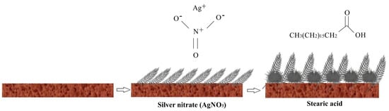 Copper foam sheets (15 mm × 15 mm × 2 mm) were ultrasonically cleaned with acetone and anhydrous ethanol for 5 min, three times alternately. The process of growing a superhydrophobic coating includes two stages as illustrated in Figure 1. The pretreated copper foam sheets were immersed in a 20 mM silver nitrate (AgNO3) ethanolic solution at 50 °C, to increase foams’ micro/nano-roughness and subsequently in a 15 mM stearic acid ethanolic solution to reduce its surface-energy. This two-stage process was recurrent for 20 and 30 min immersion times in silver nitrate solution and for 20, 30, 40, 50 and 60 min in stearic acid solution. Finally, the produced coated copper foams were washed with deionized water and dried at room temperature. It should be mentioned that small quantities of both chemical compounds were used. Specifically, 0.17 g of silver nitrate and 0.21 g of stearic acid are sufficient quantities to coat four samples of copper foam sheets. Therefore, the use of silver nitrate does induce a considerable cost increase in the production process.