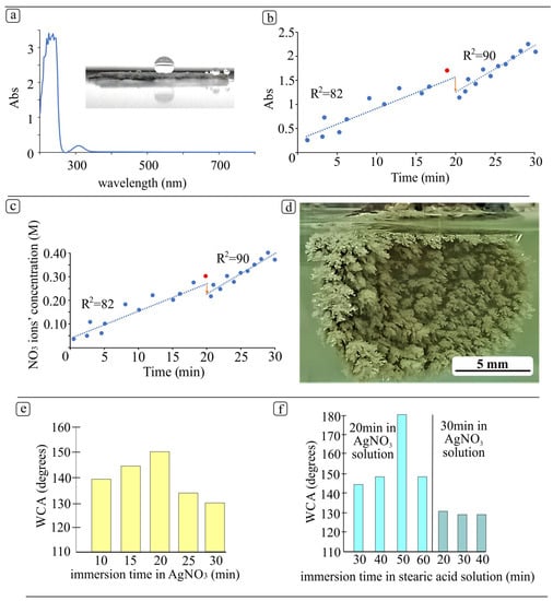 (a) Indicative UV-vis absorption spectrum, (b) nitrate ions’ absorbance as a function of time, (c) nitrate ions’ concentration as a function of time, (d) development of silver coating on the copper foam substrate, (e) WCA measurements for different minutes of immersion time in AgNO3, (f) WCA’s measurements for 20 min and 30 min of immersion time in AgNO3 solution as a function of various immersion times in stearic acid solution.