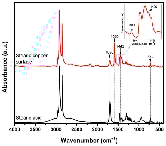 To identify the chemical bonds of the system and confirm the presence of the stearic acid, ATR-FTIR measurements were conducted for the superhydrophobic copper foam sample prepared under the optimum conditions. Figure 3 shows the ATR-FTIR spectra of stearic acid (solid) and stearic copper surface after modification, for comparative reasons. The results exhibit the presence of stearate together with that of stearic acid because of the C-H bands at 3000–2800 cm−1, at 1698 cm−1 (-COOH) and at 720 cm−1 (-CH2) [42,43,44,45]. However, the emergence of a band at 1585 cm−1 indicates the formation of copper stearate. The concurrent presence of silver stearate cannot be excluded, because of two bands of low intensity (inset of Figure 3) at 1512 and 1420 cm−1, which correspond to -COO- asymmetric and symmetric stretching, respectively.