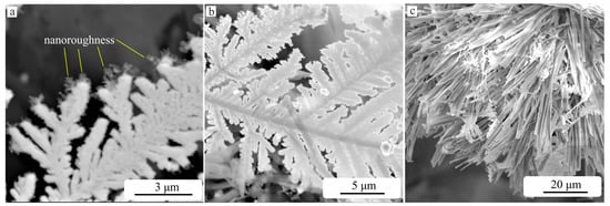 Higher magnification SEM images of the modified copper foam prepared under optimum conditions (shown in Figure 4) clearly revealed two different morphologies on the surface. The leaf-like nanorods and highly branched dendrites correspond to Ag morphologies (Figure 4a,b). These fractal-like structures are composed of many self-assembled polygonals which were identified by EDS analyses as silver. In Figure 4a, a two-tier roughness is revealed, on a larger scale, e.g., a micro-roughness stemming from the leaf morphologies and a nano-roughness (indicated by arrows) on the surface of these leaf/dendritic morphologies as shown in Figure 4a. Similar leaf-like and dendritic morphologies are well documented in literature [46,47]. The above results are in accordance with the literature which reports that the formation of silver superhydrophobic nanocoatings follows a process of initial reduction, nucleation, adsorption, growth, branching, and further growth [46,47,48]. Developed morphologies of the silver film depend on the Ag+ reaction time and the strength of the reducing agent(s) in the system. Leaf like morphologies are favored in low strength reducing agent, which in our case is the copper foam substrate [48].