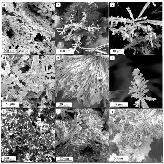 Figure 5 depicts SEM images of hydrophobic coated copper foams produced at different immersion times in stearic acid solution. Figure 5a shows the morphology of the initial copper foam substrate before the growth of silver coating, for reasons of comparison. Figure 5b,c show the coating’s morphology for 20 min of immersion in silver nitrate solution and 40 min in stearic acid solution. Fractal-structure morphologies of the film are not developed completely. Few small sized stems, branches and leaf-like structures are depicted. Figure 5d–f depict surface morphology of the optimum coated copper foam which reacted in silver nitrate solution for 20 min and in stearic acid solution for 50 min. Leaf-like and micro-flower structures are completely developed. It is clear that micro-nano hierarchical dendritic structures and nanoribbons are fully developed, which is also consistent with the WCA measurements that demonstrate a super-hydrophobic behavior of this sample. Figure 5g–i depict the microstructure which corresponds to 20 min of immersion in silver nitrate solution and 60 min of immersion in stearic acid solution. Spherical micro-clusters of flower-like morphology prevail, which indicates the presence of copper stearate; however, it seems that the silver leaf-like morphology was affected and was hardly visible in SEM images. This is probably ascribed to the extending coverage of the copper substrate with the flower-like copper stearate morphologies that either cover the original silver leaf morphologies or destroy them during the stacking of the nanosheets of the copper stearate. Similar behavior was observed in [49] where the copper stearate morphologies prevailed over all other formed nanostructures when the immersion time was increased.