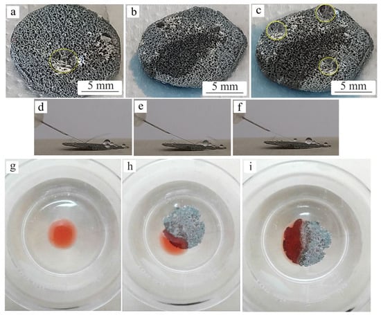 (a–c) Oil and water droplets, (d–f) continuous needle flushing test and (g–i) oil absorption test using a superhydrophobic copper foam.