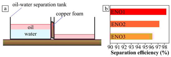 To estimate the oil/water separation efficiency, the optimum superhydrophobic coated copper foam (having the highest WCA) was chosen for all cases examined. A two section rectangular small tank (Figure 7a) was employed. It was filled with 60 mL of water and 20 mL of various engine oils. Two-stroke engine oil (ENO1) has the lowest viscosity and car engine oil 20W-50 (ENO3) is the thickest of the three.