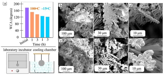 (a) WCA measurements after thermal treatment in 100 °C and −15 °C. SEM images of morphologies after thermal treatment (b–d) after 1 h in −15 °C, (e–g) after 1 h in 100 °C.