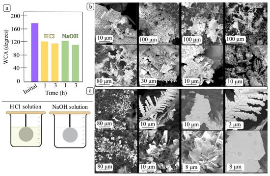 (a) WCA measurements after chemical treatment in acidic and alkaline solutions. SEM images of morphologies after (b) after 1 h in HCl solution, (c) after 1 h in NaOH solution.