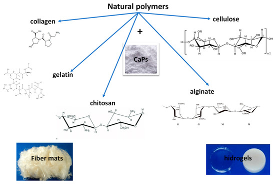 Graphical illustration of the most common natural polymers that can be used as CaP-containing composites. The applications of these materials are extremely broad, since they can be produced either as hydrogels or fiber mats.
