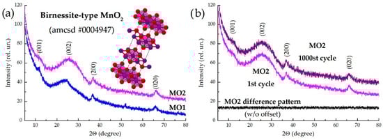 The XRD patterns (Figure 3a) of the MO1 and MO2 samples show broad featureless peaks close to the crystal structure of birnessite MnO2 (amcsd #0004947). The obtained data may indicate a low crystallinity and an amorphous nature, which is consistent with the data obtained from TEM. The poor diffraction peaks observed are a distinctive feature of birnessite (MnO2) nanocrystals with a nanosheets/nanoflakes morphology, as can be seen in a number of recent works [9,10,11,12]. The reasons for the weak peaks are the synthesis at room temperature and subsequent moderate heat treatment (150 °C).