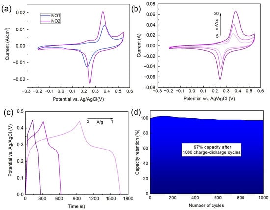 CVA curves of MO1 and MO2 (a); CVA curves at several scan rates (b) of MO2; GCD at several current density curves (c) of MO2; cycling stability of MO2 (at 5 A/g) (d).