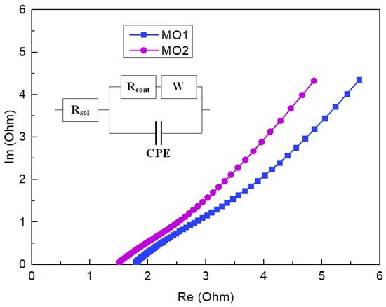 Electrochemical impedance spectra (EIS) of MO1 and MO2.
