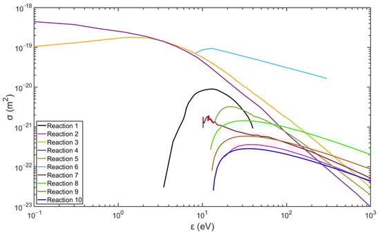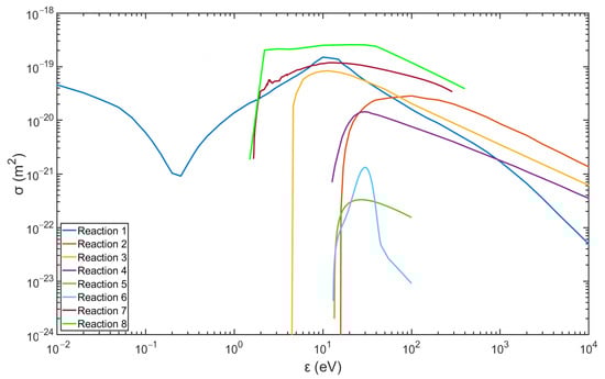 Figure 2 and Figure 3 show the data of the collision cross-sections of the reactions in Table 3 and Table 4, and the relevant data are from the databases listed, including databases of Biagi, TRINITI, NGFSRDW, IST-Lisbon, and NIST [25,26,27,28,31].