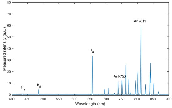 Figure 4 shows the spectrum for wavelengths between λ = 400 and 900 nm of Ar/H2 plasma, mixing with 35% hydrogen (volume flow under standard conditions) at an input of electrical power of 165 W and a pressure of 5 Pa. The Balmer lines are distinct enough to be evaluated. From the measurement result, the intensity of Hα is much stronger than that of the other two lines, which means that reaction 11 in Table 3 is the most prone transition [32].