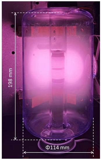 In this section, the results of measurements and simulations are presented and compared. Figure 6 and Figure 7 show an image of the stabilized plasma in the glass vessel and simulated H(3s) particle density distribution, respectively. From the structure of the coil and chamber, the discharge is symmetrical, and only half the cross-section was used to build the simulation model, as shown in Figure 7. As discussed above, ICP is generated by alternating electric and magnetic fields [34]. The higher the intensity of the electric field, the more energy can be transferred to the free electrons, resulting in higher intensity of the discharge. In the space near the coils, the intensity of the electric field is higher than in the other areas of the chamber. This is why both the plasma (Figure 6) and the simulation (Figure 7) show that ICP is mainly distributed in the center of the chamber.