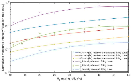 The mixing ratio has a large effect on the spectral distribution and reaction rates in the plasma, and the intensities of the lines result from the reaction rates. A comparison of the general behavior between the reaction rates and the intensities of the Balmer lines is shown in Figure 8. The intensities of the Balmer lines are normalized. Ar I-750 is chosen as the reference for normalization, and the normalized distribution is calculated by the intensities of Hα, Hβ, and Hγ divided by the intensity of argon line at λ = 750.38 nm. In the simulation model, the rates of reactions 11, 12, and 13 in Table 3 represent the frequencies at which the reactions occur and were calculated with cross-sections. As shown in Figure 8, both the normalized intensities and reaction rates increase with increasing hydrogen content. All three hydrogen lines show the same trend, and the reaction rates from the simulation results behave in a similar way. Compared to the individual emission lines and reaction rates, the simulation result agrees with the measurement result, which confirms the validation of the simulation model in terms of quantity.