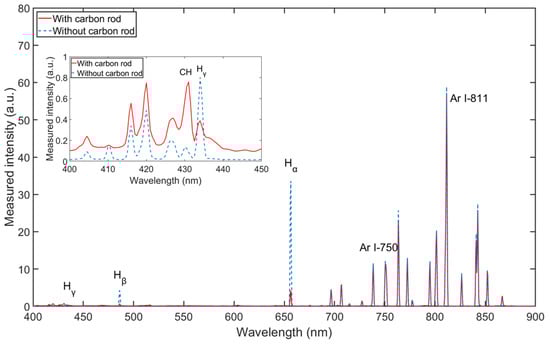 In this study, Ar/H2 non-equilibrium plasma is applied for a reaction with carbon. The above spectra measurements and simulations are based on the Ar/H2 plasma source. It is necessary to measure the spectra for the reaction between carbon and Ar/H2 plasma. As shown in Figure 1, after OES measurement of pure Ar/H2 plasma, a carbon rod made of pure graphite is introduced into the chamber. The OES measurement is performed on the Ar/H2 plasma with the carbon rod inside. The spectra are compared in Figure 9 with and without carbon under the same parameters. The intensities of the argon lines remain almost the same, while the intensities of the hydrogen lines change significantly. After the carbon rod was introduced into the plasma, all intensities of the hydrogen lines decreased. This phenomenon can be explained by the fact that the radical hydrogen atoms are almost absorbed by the carbon rod, and chemical reactions occur between the hydrogen atoms and the carbon atoms. After zooming in the figure from 400 to 450 nm, the intensity at 431.42 nm has definitely increased because of the introduction of carbon. The line at 431.42 nm is one of the typical wavelengths of CH [35]. CH is the main band in volatile hydrocarbon molecules, such as CH4, C2H6, etc. The increase in CH intensity provides evidence for reaction products. In the Ar/H2 mixed plasma, hydrogen is designated as the primary gas to provide the source of the radical atoms, and argon is added as a secondary gas to change the density of the radicals in the plasma [24].