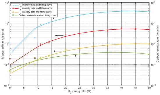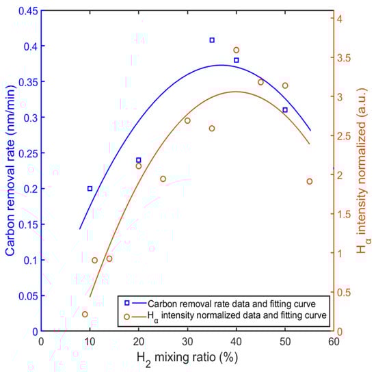 Comparison between normalized intensity of Hα and carbon removal rate with different mixing ratios.