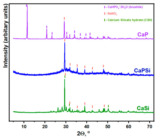 XRD data of powders after synthesis and disaggregation in acetone (CaP, CaPSi, and CaSi). (PDF card 9-77)—brushite, (PDF card 36-1474)—sodium nitrate, (PDF card 33-306)—calcium silicate hydrate.