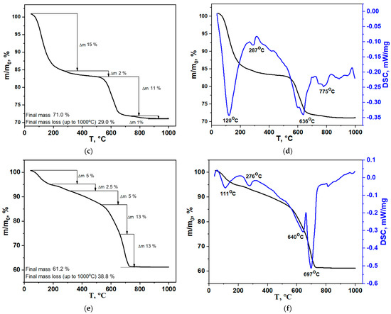 (a) step change in mass, and (b) TG/DTA curves obtained for the CaP synthesized powders; (c) step change in mass, and (d) TG/DTA curves obtained for the CaPSi synthesized powders, and (e) step change in mass, and (f) TG/DTA curves obtained for the CaSi synthesized powders.