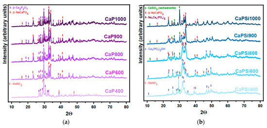After the heat treatment at 400 °C, the formation of hydroxyapatite and wollastonite occurred for the CaPSi sample. Presence of H2O at high temperature give us an opportunity to guess that hydroxyapatite was formed under hydrothermal conditions. At 600 °C, the formation of hydroxyapatite from the amorphous phase, accompanied with the formation of sodium rhenanite from the amorphous phase and NaNO3, occurred. The heat treatment at 800 °C led to the formation of tetraphasic ceramics, containing sodium rhenanite, hydroxyapatite, wollastonite and the Na3Ca6(PO4)5 phase. The phase composition of the CaPSi ceramic samples after the heat treatment in the range of temperatures from 900 to 1000 °C (Figure 4b, Table 3) remained almost unchanged. These samples after heat treatments at 900 and 1000 °C contained wollastonite (α-CaSiO3), sodium rhenanite (NaCaPO4), and mixed calcium-sodium phosphate (Na3Ca6(PO4)5). Nevertheless, the phase ratios varied depending on the heat treatment temperature. With an increase in the heat treatment temperature the phases tended to become more crystallized. The reflexes of the wollastonite (α-CaSiO3) phase increased in the range of temperatures from 800 to 1000 °C, while the hydroxyapatite phase disappeared. After this temperature, heterophase reactions between hydroxyapatite and sodium rhenanite occurred, leading to the formation of Na3Ca6(PO4)5.