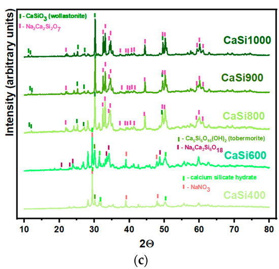 In the case of the CaSi sample after the thermal treatment at 400 °C, there were no significant changes in phase composition, in comparison with the phase composition before the thermal treatment. After the thermal treatment at 600 °C, the formation of Ca5Si6O16(OH)2 and Na6Ca3Si6O18 occurred. Two-phase composite ceramics including wollastonite (α-CaSiO3) and Na2Ca2Si2O7 (Table 3, Figure 4; ICDD PDF2 database [53]) were also obtained after heat treatment of the CaSi samples at the range from 800 to 1000 °C.