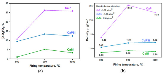 The CaP sample had the largest linear shrinkage (up to 26% at 900 and 1000 °C), and the CaSi sample had the smallest linear shrinkage (up to 5%) (Figure 6a). Linear shrinkage for the CaPSi sample ranged from 9 to 13% at 800 to 1000 °C, respectively. At the same time, fluctuations in density changes depending on the temperature for the CaPSi samples are minor, since the obtained components have approximately the same density (1.05–1.22 g/cm3).