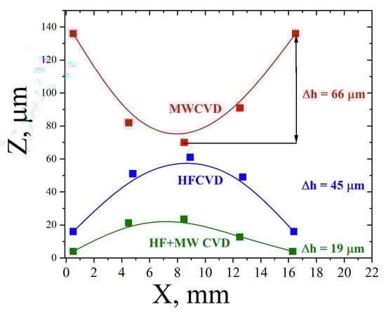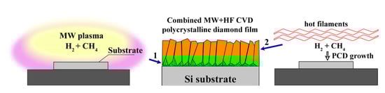 Sedov, V.; Popovich, A.; Linnik, S.; Martyanov, A.; Wei, J.; Zenkin, S.; Zavedeev, E.; Savin, S.; Gaydaychuk, A.; Li, C.; et al. Combined HF+MW CVD Approach for the Growth of Polycrystalline Diamond Films with Reduced Bow. Coatings 2023, 13, 380. https://doi.org/10.3390/coatings13020380