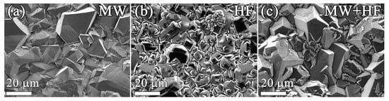 - Ralchenko, V.G.; Smolin, A.A.; Konov, V.I.; Sergeichev, K.F.; Sychov, I.A.; Vlasov, I.I.; Migulin, V.V.; Voronina, S.V.; Khomich, A.V. Large-Area Diamond Deposition by Microwave Plasma. Diam. Relat. Mater. 1997, 6, 417–421. [Google Scholar] [CrossRef]