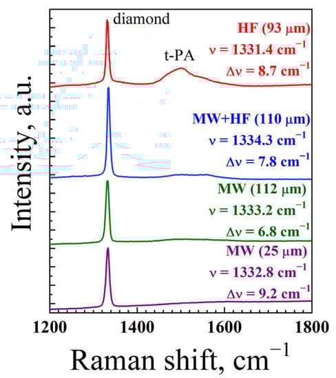 - Vlasov, I.I.; Goovaerts, E.; Ralchenko, V.G.; Konov, V.I.; Khomich, A.V.; Kanzyuba, M.V. Vibrational Properties of Nitrogen-Doped Ultrananocrystalline Diamond Films Grown by Microwave Plasma CVD. Diam. Relat. Mater. 2007, 16, 2074–2077. [Google Scholar] [CrossRef]